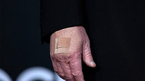 ▲ 2025년 12월 7일 미국 수도 워싱턴DC 소재 케네디 공연예술센터에서 열린 행사에 참석한 도널드 트럼프 미국 대통령의 오른손 손등에 반창고가 붙어 있다.