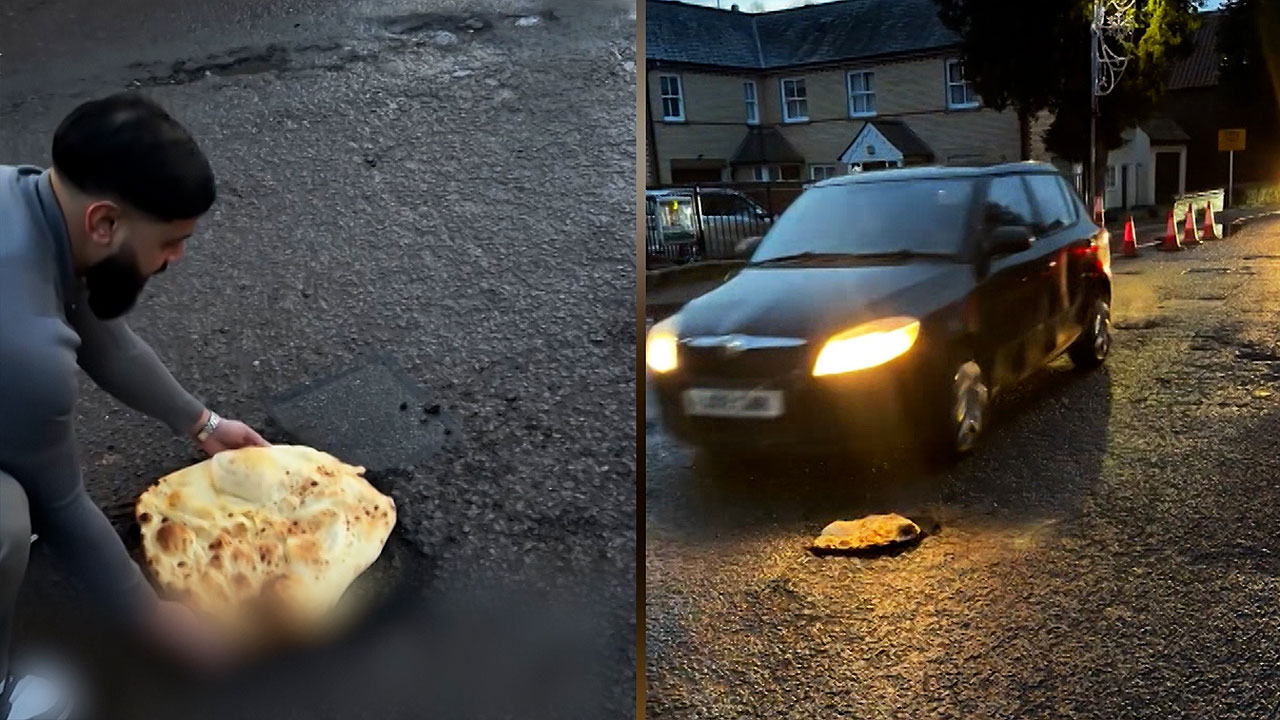 한 남성이 잘 구운 빵 하나를 집어들고는 도로 위 구멍에 내려놓습니다.