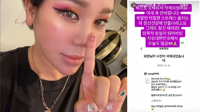 김송은 최근 자신의 SNS에 "욕 발언이 터질 땐 스트레스가 풀리지만 정신 건강에는 좋지 않더라"며 "욕은 못 노출돼 삭제됐고, 이제 욕은 안 하려 한다"고 적었다. 이어 "그래도 할 건 해야 한다"며 '멸공'이라는 글을 올렸다.