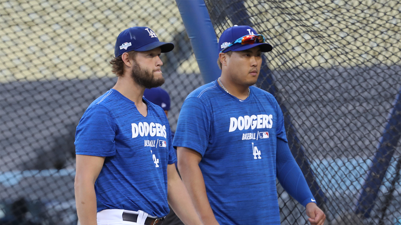 ▲ 지난 2019년 로스앤젤레스 스타디움에서 열린 다저스 훈련에서 류현진과 커쇼가 훈련을 마친 뒤 더그아웃으로 향하고 있다.