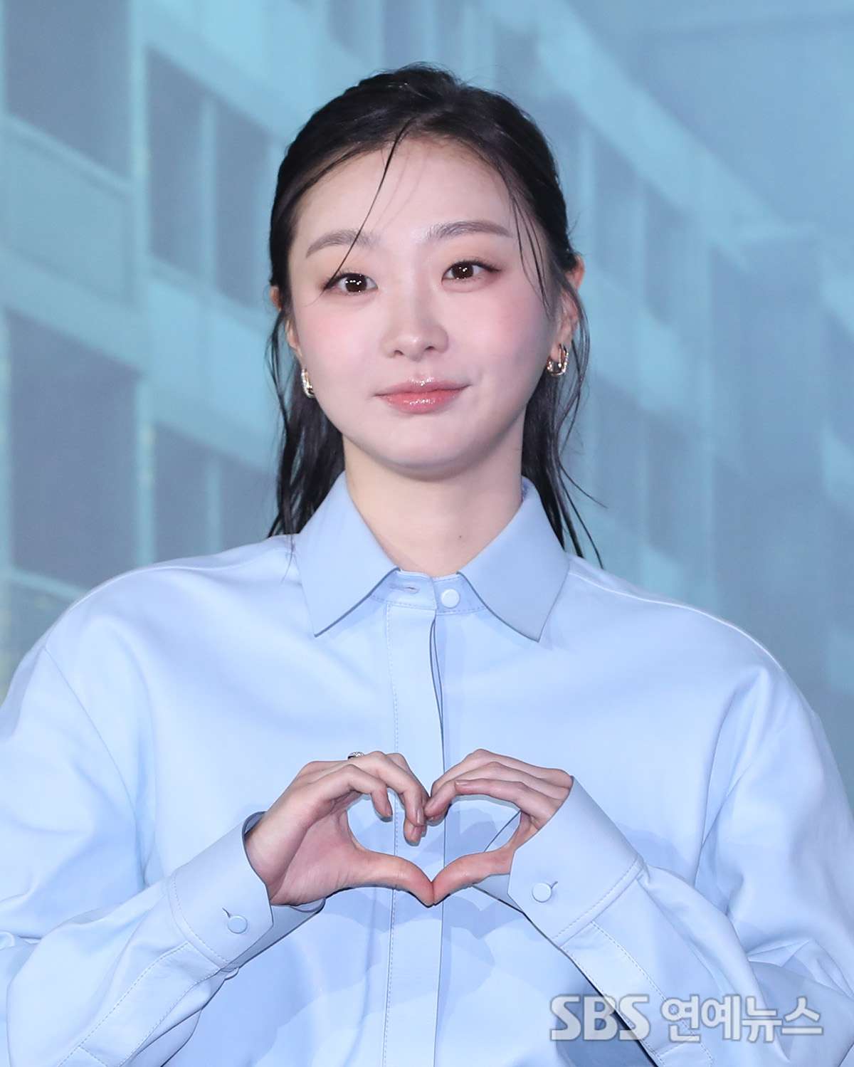 Kim Da Mi lit up a morning press conference for the Netflix film 'The Great Flood' at CGV Yongsan I'Park Mall in Seoul on Dec. 16, flashing a playful heart pose during the photo call.