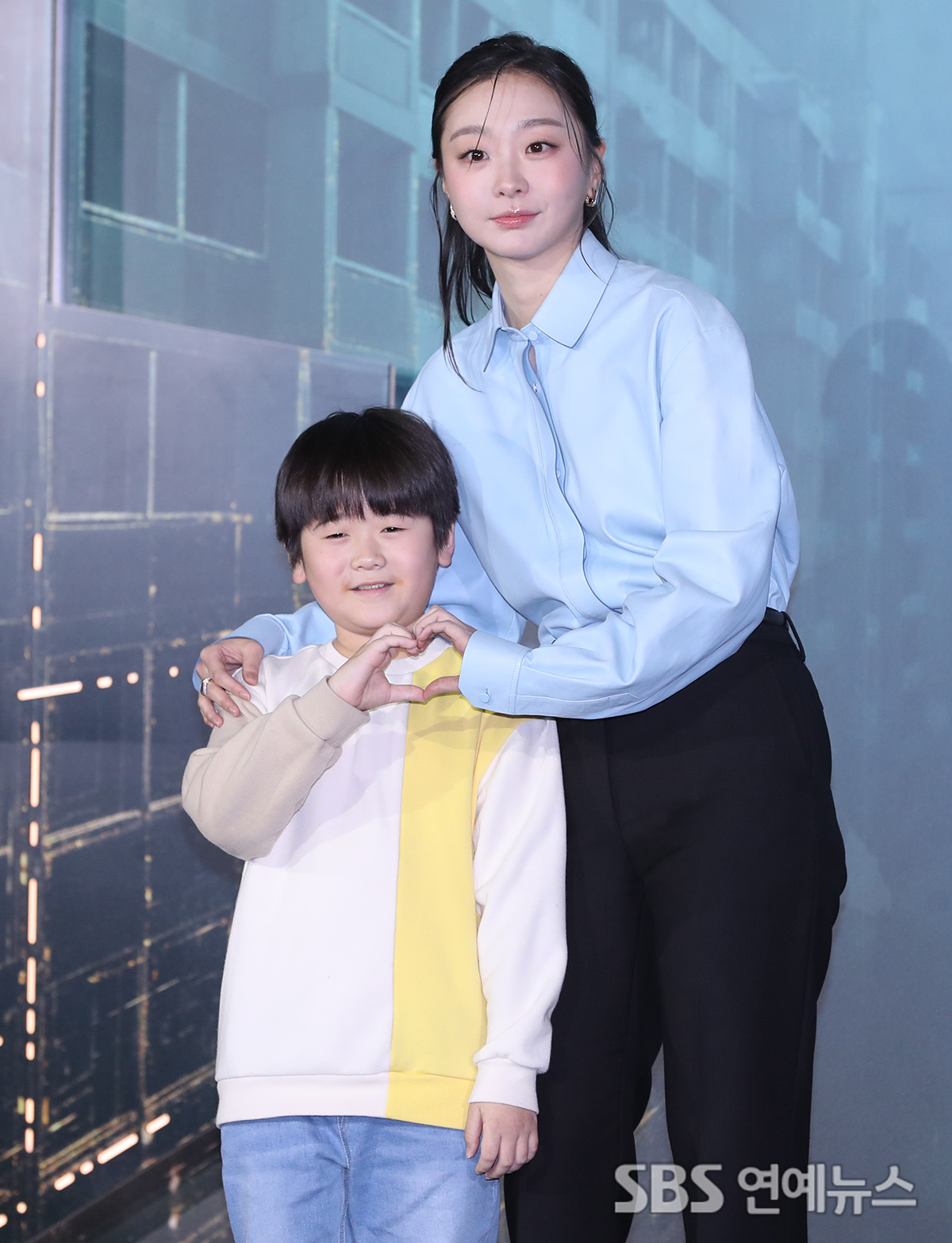 Kwon Eunseong (left) and Kim Da Mi pose for a photo call at a press conference for the Netflix film The Great Flood at CGV Yongsan I'Park Mall in Seoul on Dec. 16.