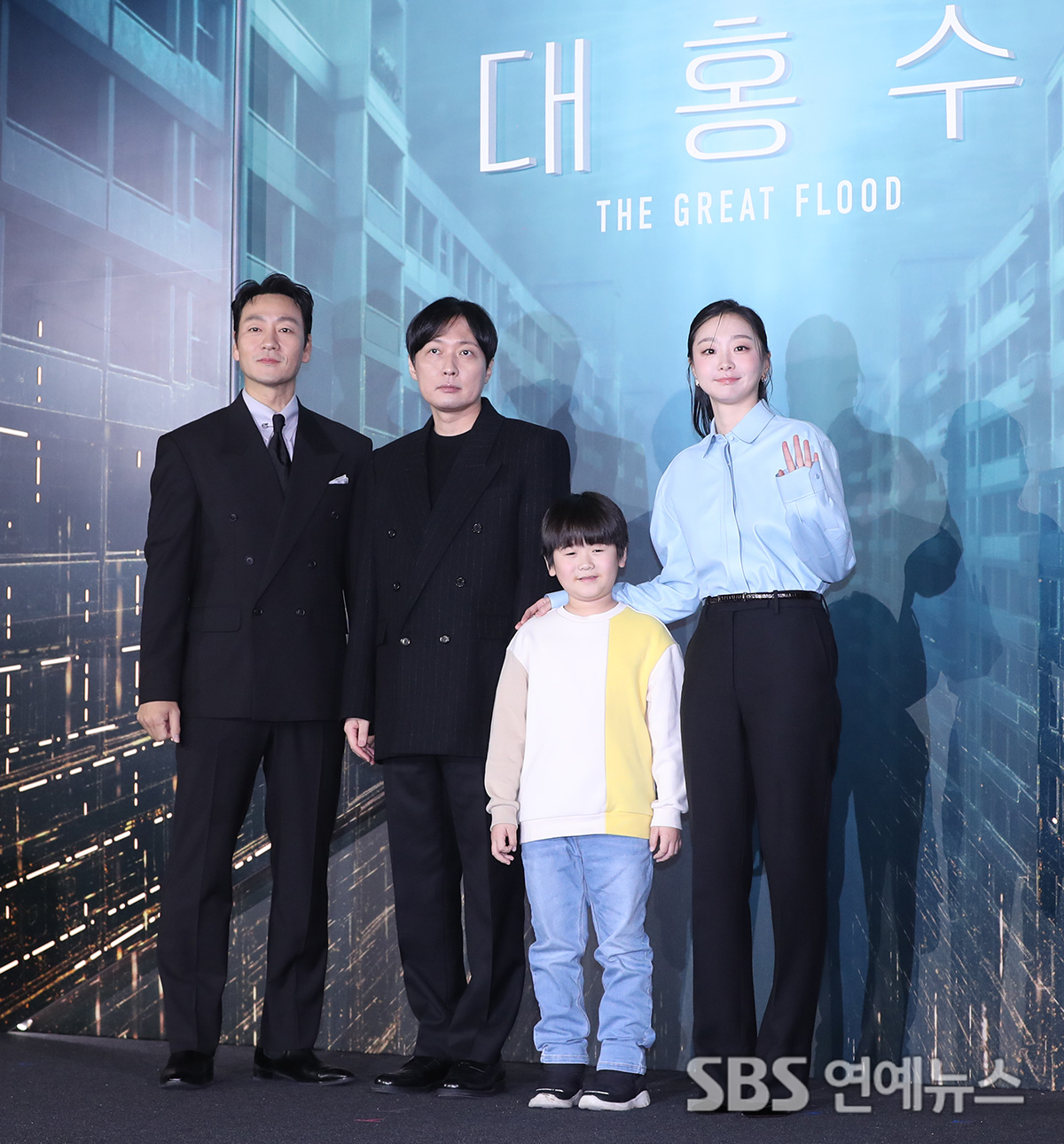 From left, Park Hae-soo, director Kim Byung-woo, Kwon Eunseong, and Kim Da Mi step out for a photo call at CGV Yongsan I'Park Mall in Seoul on the morning of Dec. 16, celebrating the Netflix sci-fi disaster film "The Great Flood."