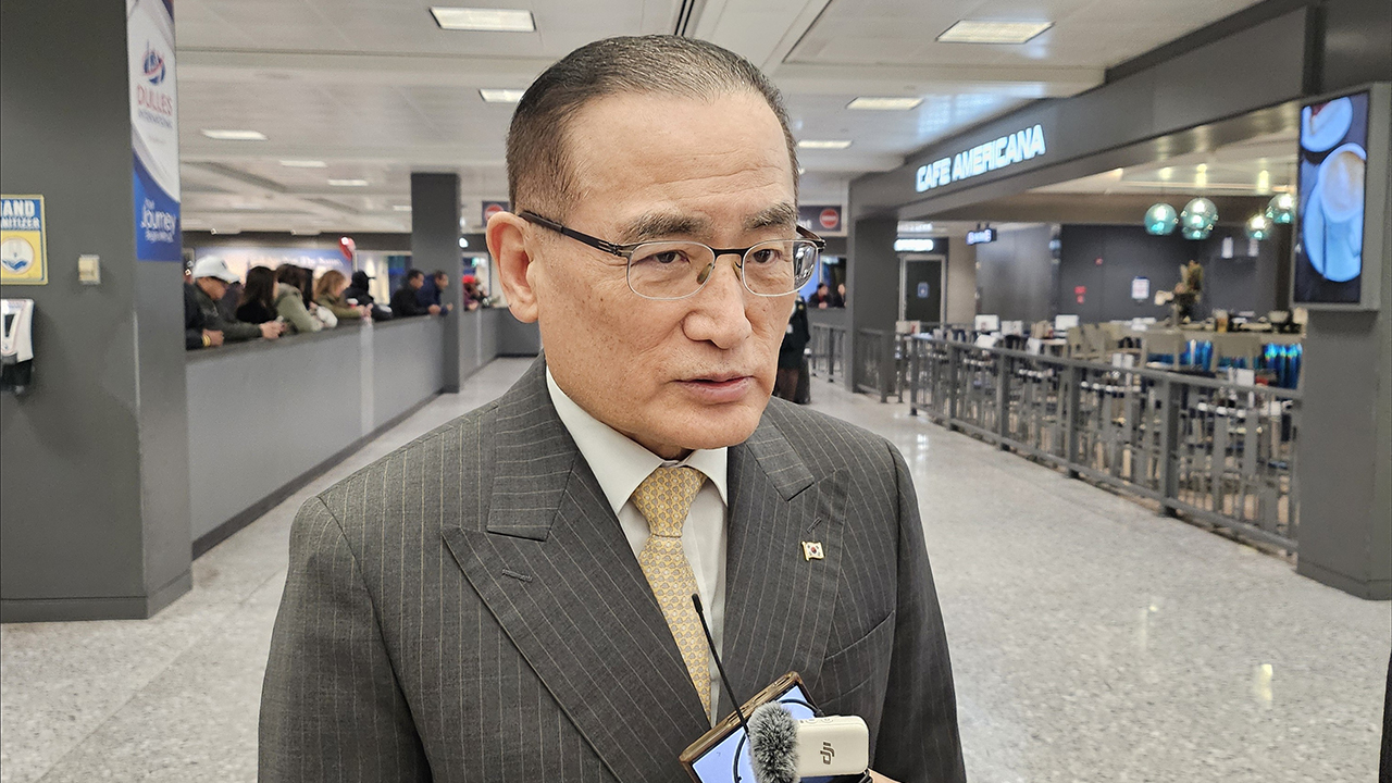 ▲ 미국을 방문한 위성락 국가안보실장이 16일(현지시간) 워싱턴 DC 인근 덜레스 국제공항을 통해 입국해 취재진의 질문에 답변하고 있다.