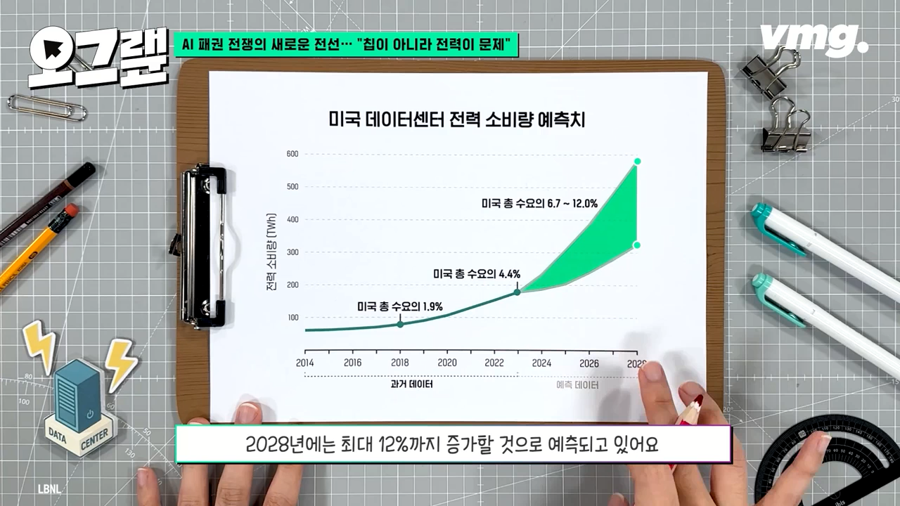 2010년대 미국의 AI 데이터센터에서 소비되는 전력량은 총수요의 1.9% 수준에 불과했습니다. 하지만 2023년엔 전력 소비가 전체의 4.4%로 증가했고 2028년에는 최대 12%까지 증가할 것으로 예측되고 있어요.