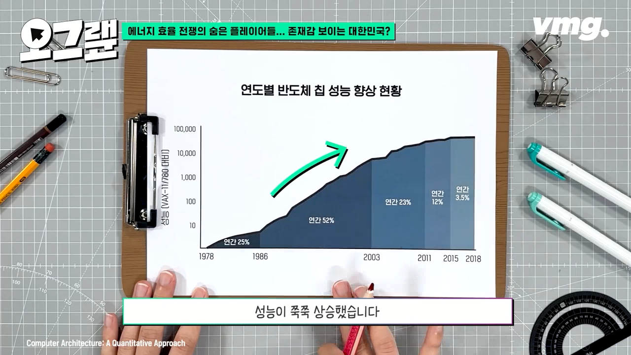 1970년대부터 2000년대 초까지는 트랜지스터를 평면에서 계속 작게 만들기만 해도 성능이 쭉쭉 상승했습니다. 연간 최대 50% 가까이 튀어 오를 정도로요. 하지만 2000년대 중반 이후에는 상승폭이 크게 줄어듭니다. 작아진 트랜지스터가 전류를 잡아두지 못하는 문제가 발생했거든요. 게다가 연산하면서 발생하는 발열량도 크게 늘어나고, 데이터가 메모리를 왔다 갔다 하면서 전력을 꽤나 소비한다는 것도 해결해야 할 과제로 등장하게 됩니다.