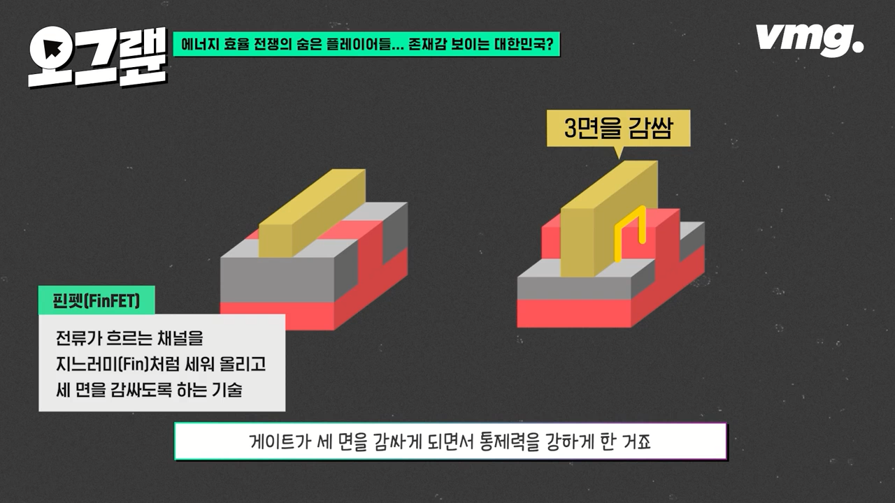일단 크기가 워낙 작아지니까 전류의 시작점과 도착지점이 너무 짧아졌고 그러다 보니 게이트를 닫더라도 통제를 무시하고 전류가 그냥 새어나갔어요. 그 당시 반도체 기업들이 이 문제를 해결하기 위해 선택한 건 트랜지스터를 평면이 아닌 입체로 만드는 거였습니다. 기존엔 전류가 흐르는 길이 평면이었다면 물고기 지느러미처럼 3D로 세워서 게이트가 세 면을 감싸게 되면서 통제력을 강하게 한 거죠.