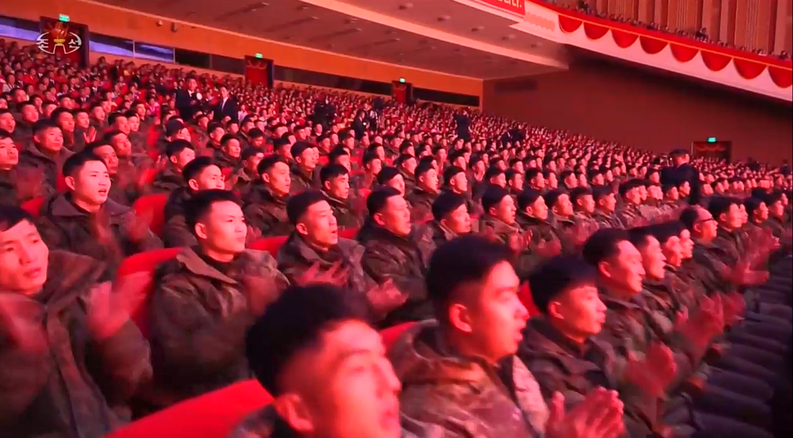 김정은은 이날 공병부대원들의 귀국을 축하하는 공연을 개최했습니다. 부대원들과 가족들이 대거 참석했고 김정은도 함께 공연을 관람했는데, 조선중앙TV가 간간이 비춘 방청석을 보면 검은 양복을 입고 있는 사람들이 유난히 눈에 많이 띕니다.