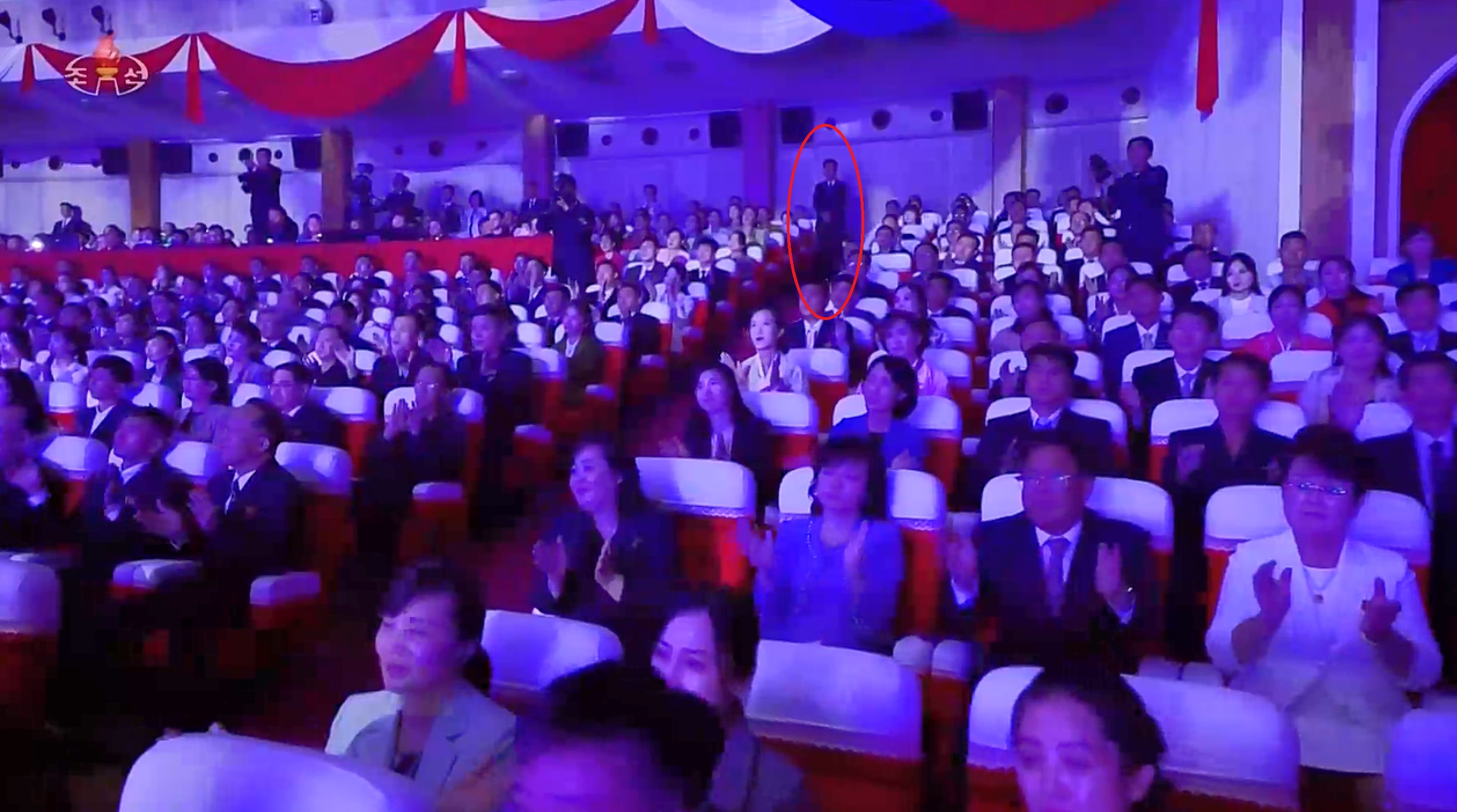 조선중앙TV가 당시 방송한 화면을 보면 방청석에서 역시 김정은의 경호원들이 관찰됩니다. 카메라맨 뒤에 서 있는 경호원도 있고 방청석 뒤편에 서 있는 경호원도 보입니다. 다만, 이들은 카메라맨 바로 뒤에 붙어있거나 방청석 맨 뒤편에 서서 관람객들의 시야를 최대한 가리지 않는 방식으로 경호하고 있습니다. 또, 관람석에 배치된 경호원 수 자체가 그리 많지 않다는 생각을 하게 됩니다. 지난 12일 공연에서 경호원들이 관람석 여기저기서 보이는 것과는 다른 모습입니다.