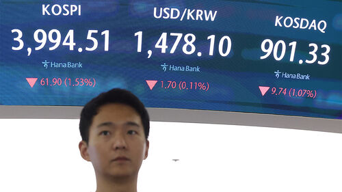 ▲ 18일 오후 서울 중구 하나은행 본점 딜링룸 현황판에 코스피, 원/달러 환율, 코스닥 지수가 표시돼 있다.