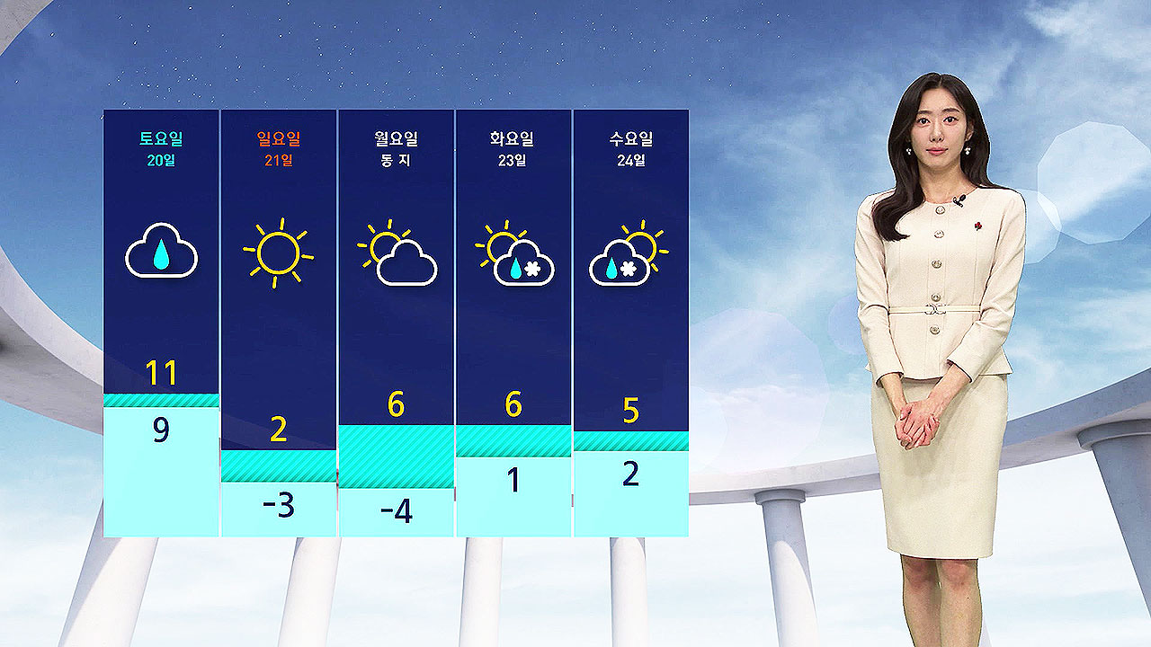 토요일에 비가 그친 뒤 일요일에는 찬 바람이 매섭게 불겠고 다음 주 화요일 오후부터 수요일 오전 사이에는 전국에 비나 눈이 내리겠습니다.