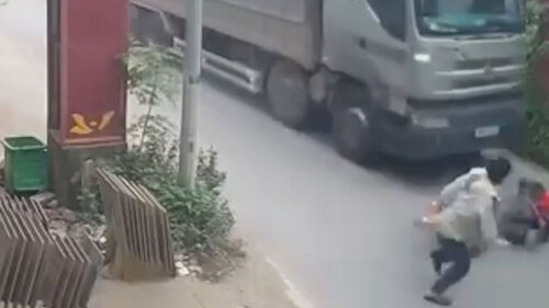 갑자기 한 남성이 일행을 트럭 쪽으로 휙 밀칩니다.