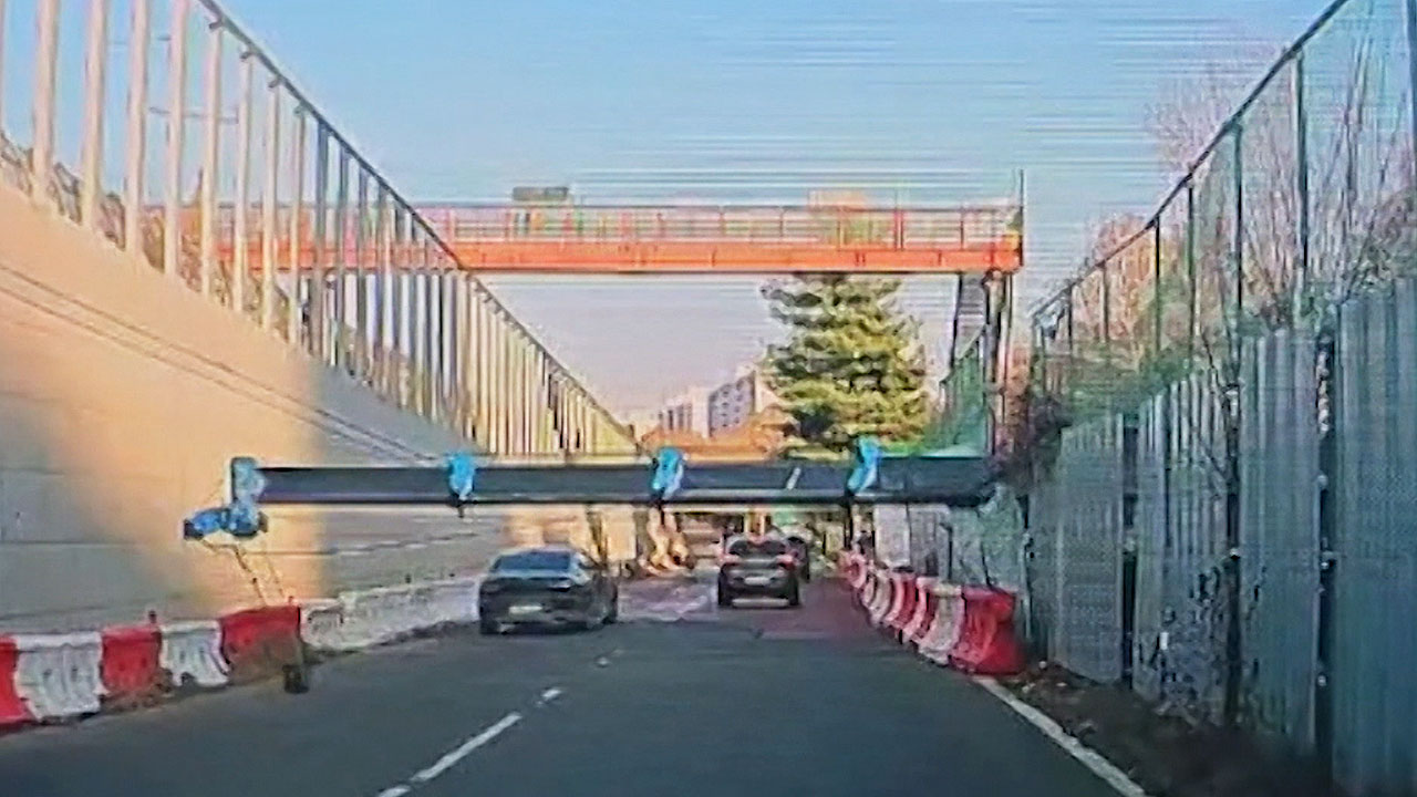 도로를 달리던 차들은 아슬아슬하게 쓰러지는 크레인을 피해 지나갑니다.