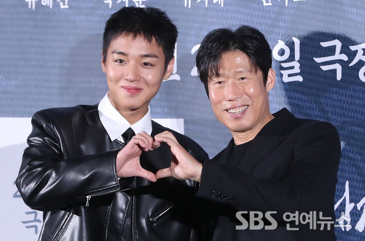 PARK JIHOON (left) and Yoo Hai-jin pose for photos at CGV Yongsan I’Park Mall in Seoul on Dec. 19 during the press conference for the historical film 'The King's Warden,' where they preview their roles as the exiled King Danjong and village chief Eom Heung-do.