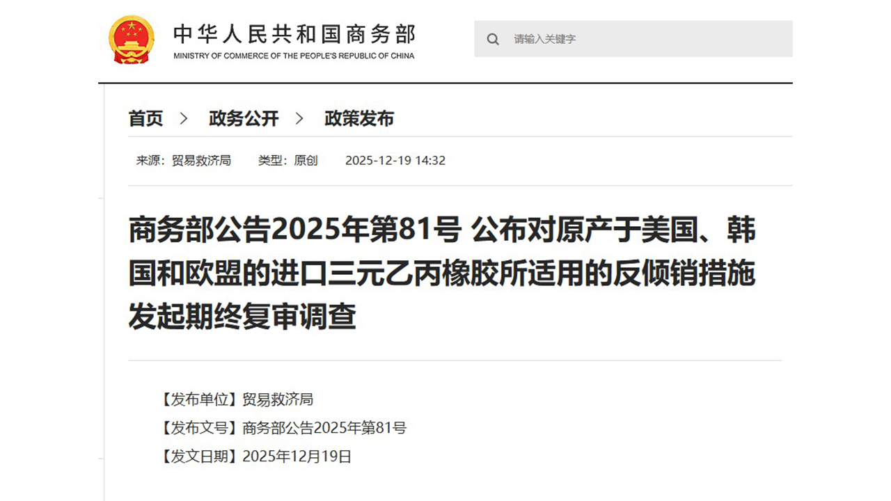중국 상무부가 한국과 미국, 유럽연합산 '기능성 합성 고무'(EPDM)에 대한 반덤핑 관세 종료를 앞두고, 이를 심사하겠다며 그동안 관세를 유지하겠다는 방침을 밝혔습니다.