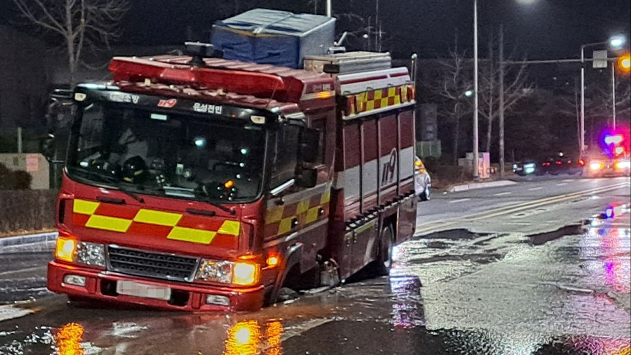 오늘(20일) 새벽 5시 47분쯤 대전 유성구 관평동 왕복 4차로에서 땅 꺼짐이 발생해 이곳을 지나던 소방차 앞바퀴가 빠졌습니다.