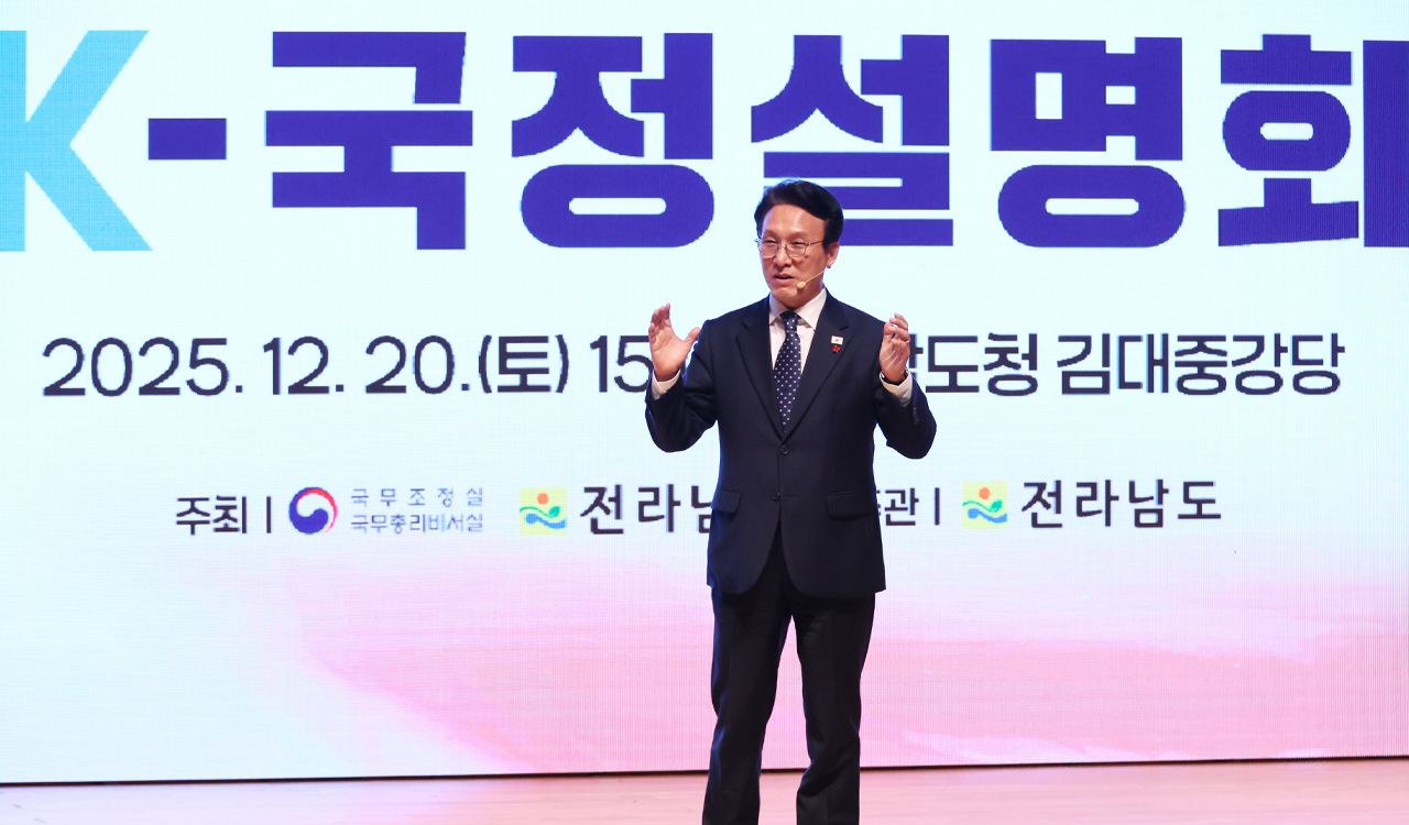 ▲ 김민석 국무총리가 20일 전남 무안군 전남도청에서 열린 K-국정설명회에서 발언하고 있다.