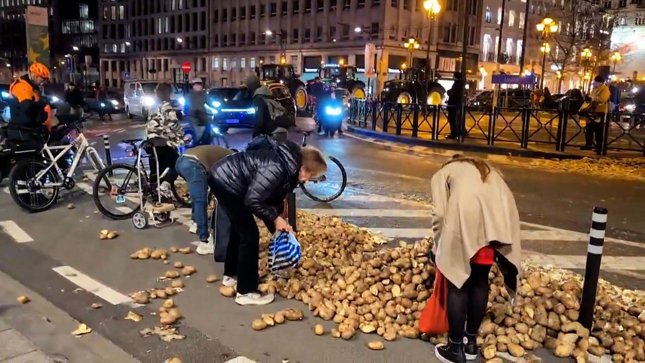 도심 길바닥에 감자가 잔뜩 깔려 있습니다.