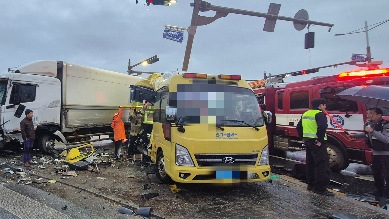 오늘(23일) 오후 4시 26분쯤 전북 김제시 백산면 돌제교차로 인근에서 윙바디 화물차와 초등학교 통학 차량이 충돌했습니다.
