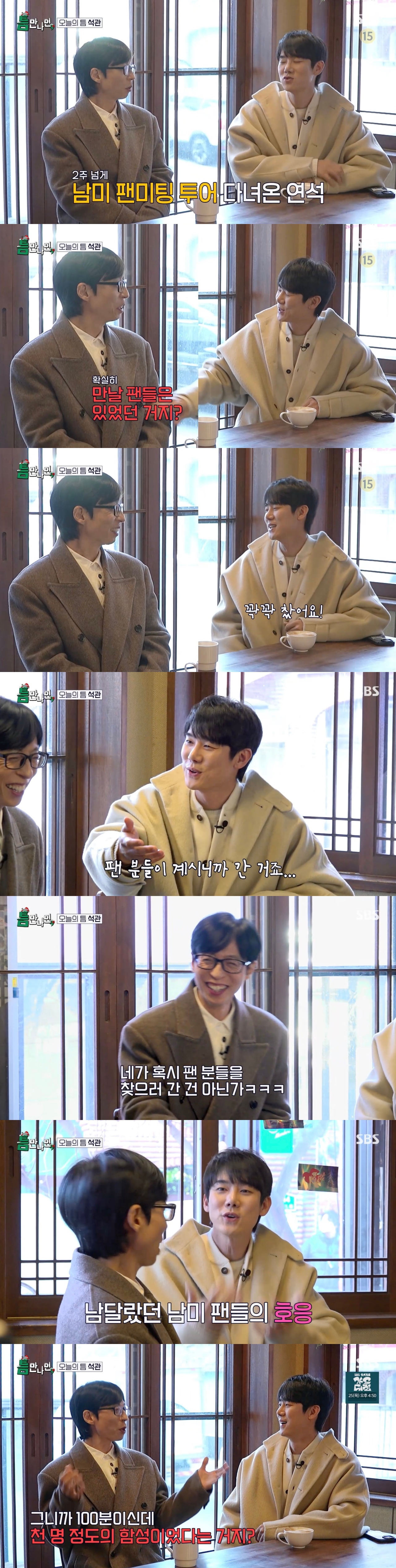 이에 유연석은 "꽉꽉 찼어요. 팬들이 계시니까 간 거죠"라고 답했다. 그러자 유재석은 "네가 찾으러 간 거 아니냐? 분명히 모여계시는 데 간 거지?"라며 유연석을 거듭 놀렸다.