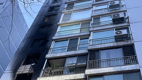 ▲ 24일 오전 서울 송파구 방이동 한 아파트 5층에서 불이 나 화재 현장 주변이 검게 그을려 있다.