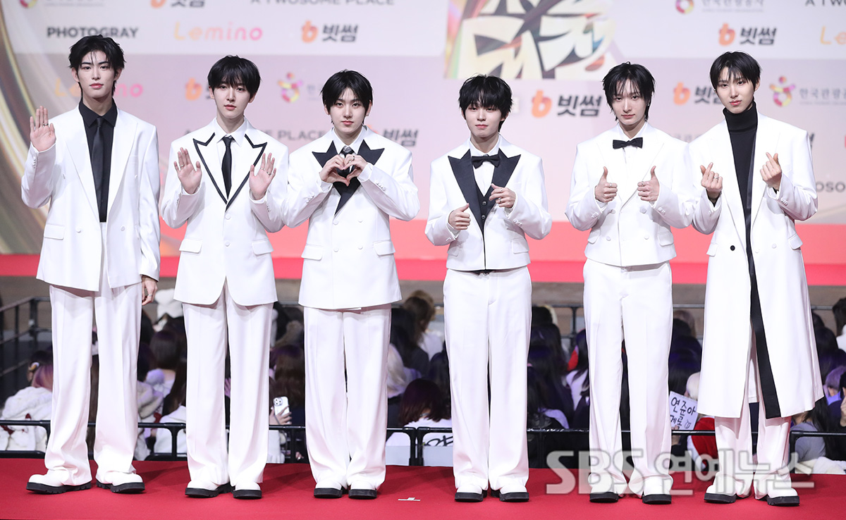 K-pop group KickFlip hit the red carpet at the 2025 SBS Gayo Daejeon at Inspire Arena in Incheon on Dec. 25, striking poses for the cameras. The group leaned into a "White Christmas" concept for the festive night.