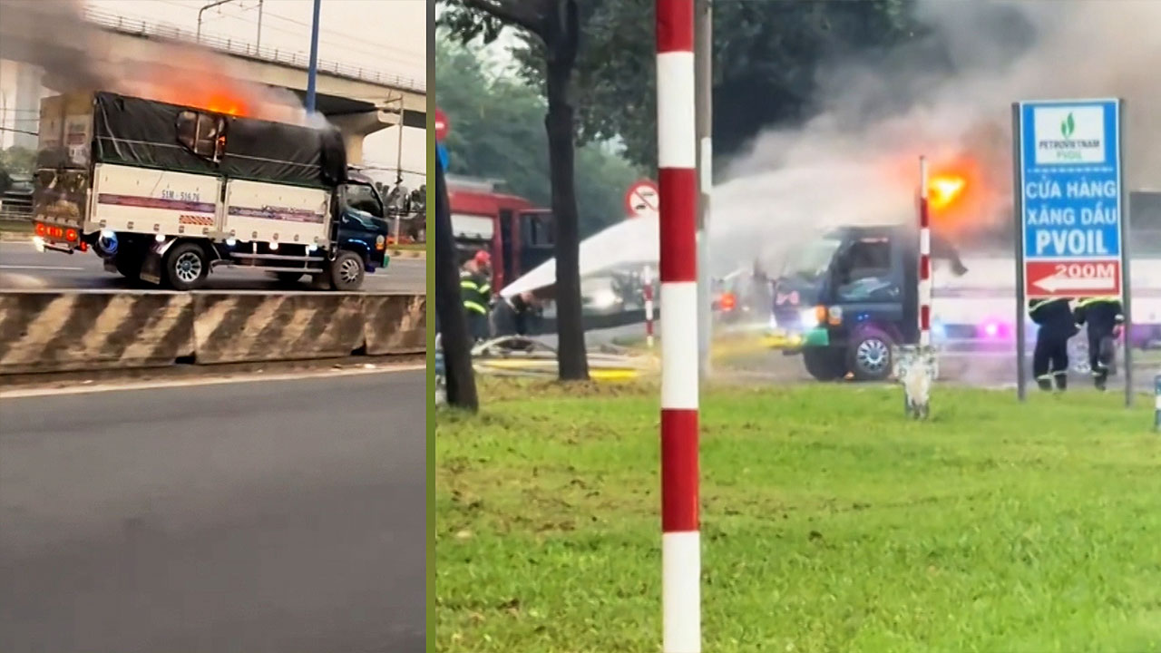 트럭 한 대가 시뻘건 불길에 휩싸인채 도로를 달리고 있습니다.