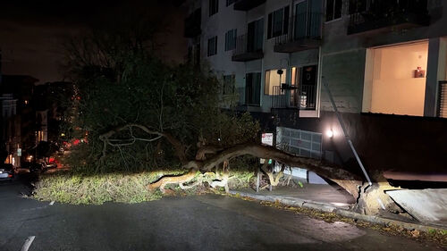 가로수 한 그루가 뿌리째 뽑혀 도로에 널브러져 있습니다.