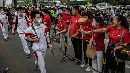 ▲ 중국의 고등학교 교사들이 대입 시험을 치르러 가는 하생들을 격려하고 있다.