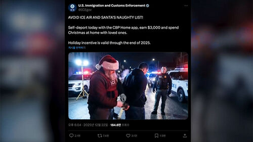 미 이민세관단속국은 한 술 더 떠 산타 복장을 한 요원들이 불법이민자들에게 수갑을 채우고 비행기에 태워 추방하는 AI 영상을 소셜미디어에 올렸습니다.