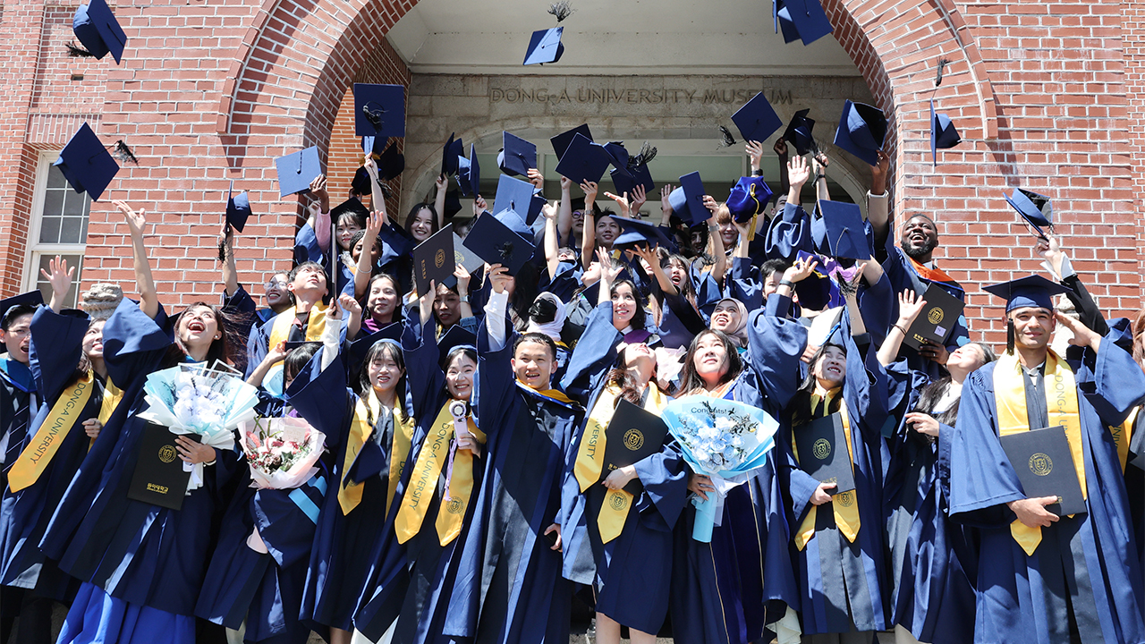 ▲ 8월 21일 부산 서구 동아대학교 부민캠퍼스에서 열린 2024학년도 후기 외국인 유학생 졸업환송회에서 식을 마친 외국인 유학생들이 석당박물관 앞에서 기념사진을 찍고 있다.