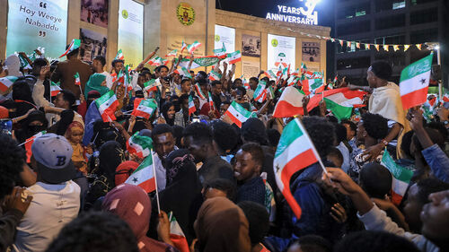 ▲ 소말릴란드 하르게이사 시내에서 26일(현지시간) 주민들이 소말릴란드 국기를 흔들며 이스라엘의 자국 국가승인을 축하하고 있다.