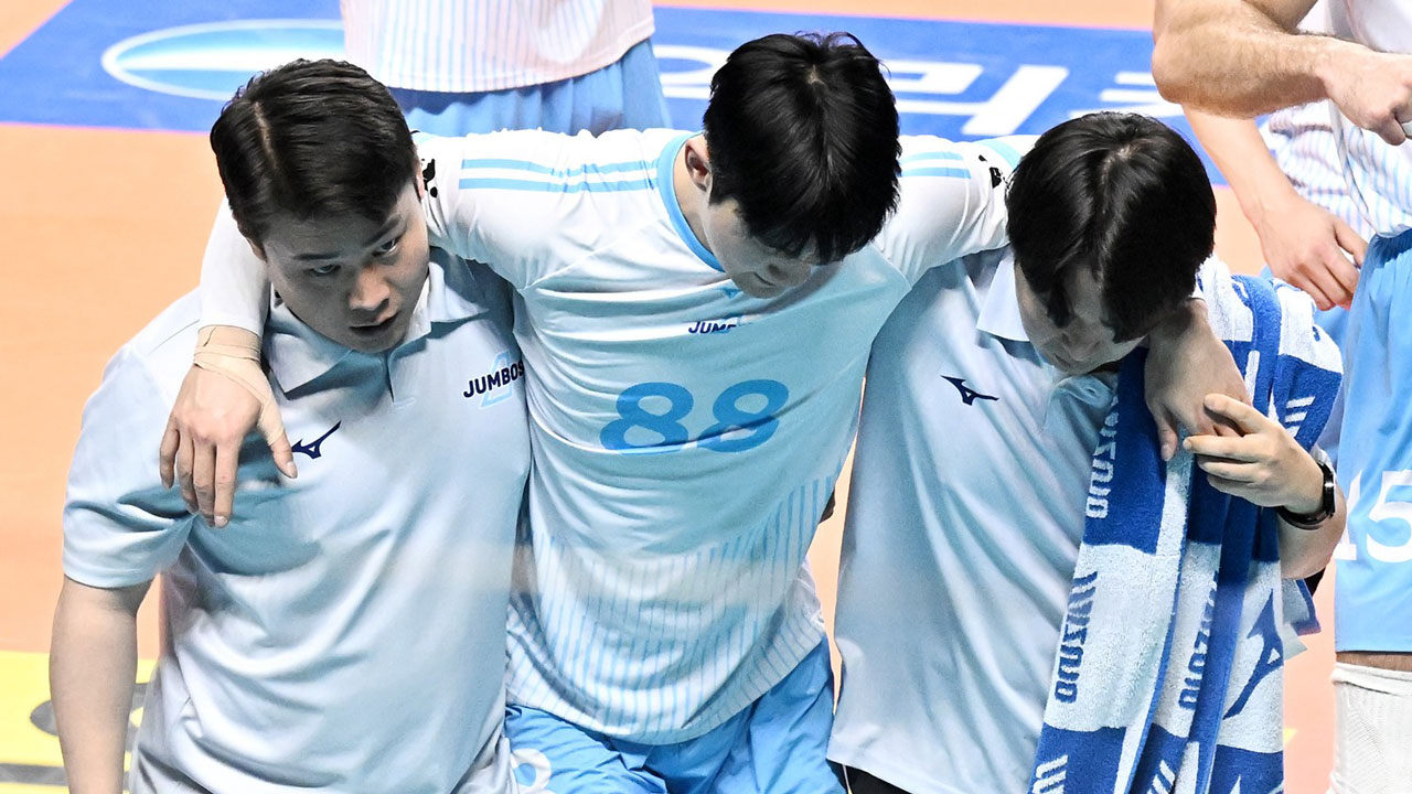 경기 도중 왼쪽 무릎을 다친 임재영은 동료 부축을 받고 코트를 벗어났고 이후 들것에 실려 병원으로 향했습니다.