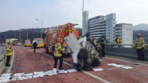 오늘(28일) 오후 1시 반쯤 강원 횡성군 횡성읍 입석리 인근 도로에서 모닝 승용차와 렉스턴 승용차가 충돌했습니다.