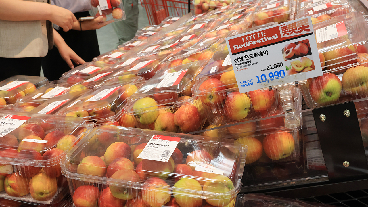▲ 지난 6월 롯데마트·슈퍼는 이날부터 경북 경산·영천지역의 우박 피해 농가에서 매입한 상생 천도복숭아(2㎏/팩)를 약 30% 저렴하게 판매했었다.