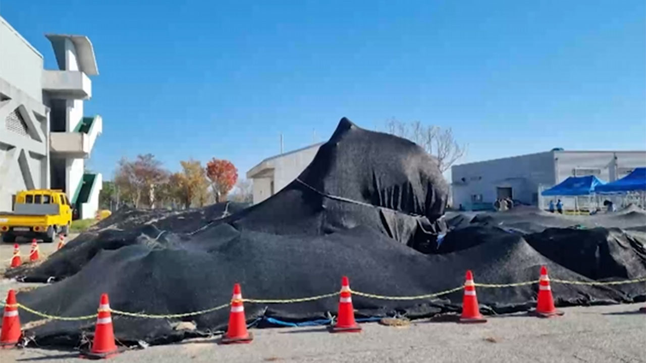 무안공항 한구석에 사고 여객기 꼬리 잔해가 검은 천막으로 덮여 있습니다.