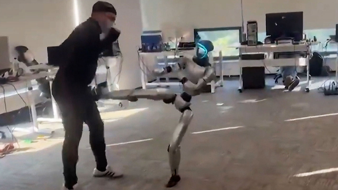 중국의 인간형 로봇이 사람의 행동을 따라 하며 모의 격투기 훈련을 하고 있습니다.