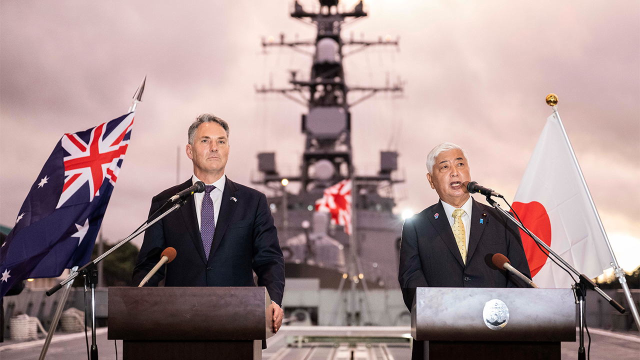 ▲ 일본이 호주에 수출을 추진 중인 모가미형 호위함에서 호주 국방부 장관과 일본 방위상이 공동 기자회견을 하고 있다.