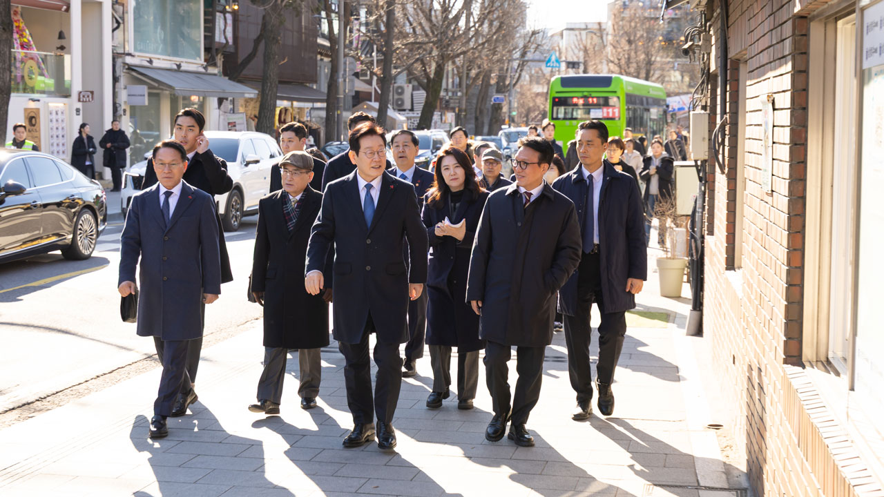 ▲ 이재명 대통령이 30일 김민석 국무총리, 구윤철 부총리, 위성락 안보실장, 강유정 대변인 등과 함께 청와대 인근 삼청동 거리를 걷고 있다.