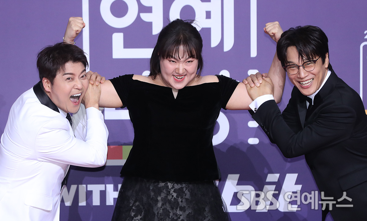 Jun Hyun-moo, Lee Su-ji, and Cha Tae-hyun strike a pose on the photo wall at the 2025 SBS Entertainment Awards, held at SBS Prism Tower in Sangam, Mapo-gu, Seoul, on the evening of Dec. 30.