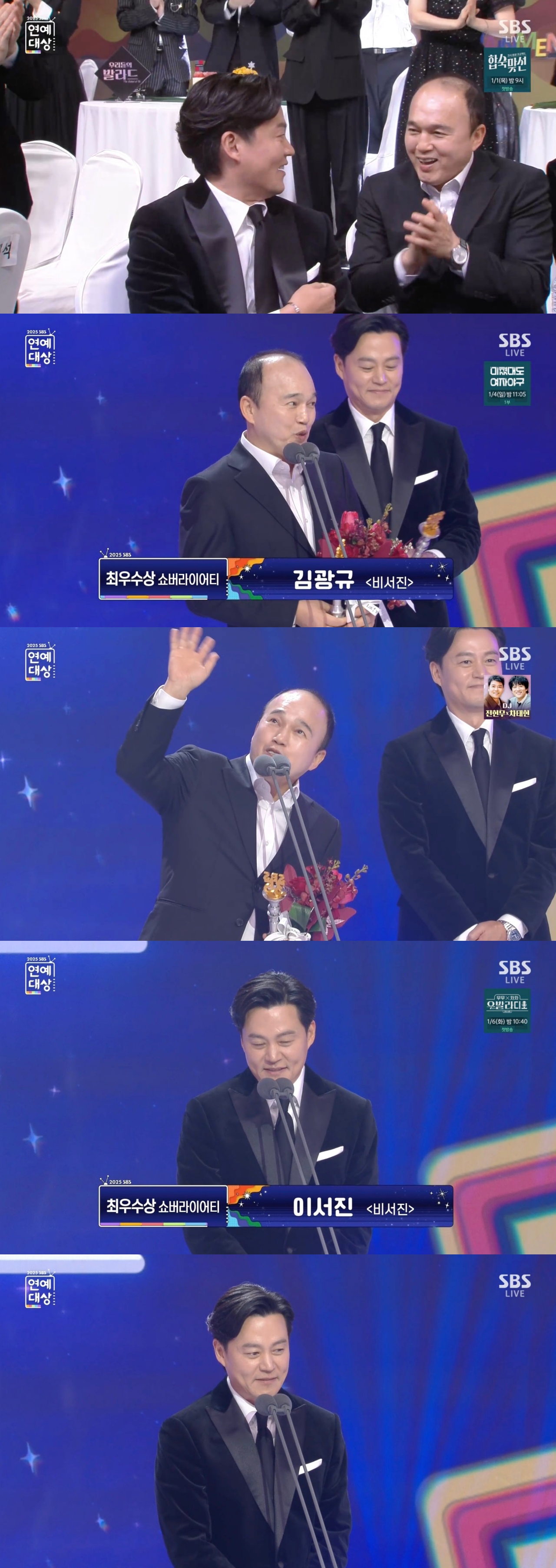 이날 두 사람은 쇼버라이어티 부문 최우수상을 수상했다. 김광규는 "좋은 프로그램에 불러준 제작진께 감사하다"라며 "이름을 한 명 한 명 불러주고 싶은데 나 대신 서진이가 잘 불러줄 거다"라며 제작진에게 고마움을 전했다.