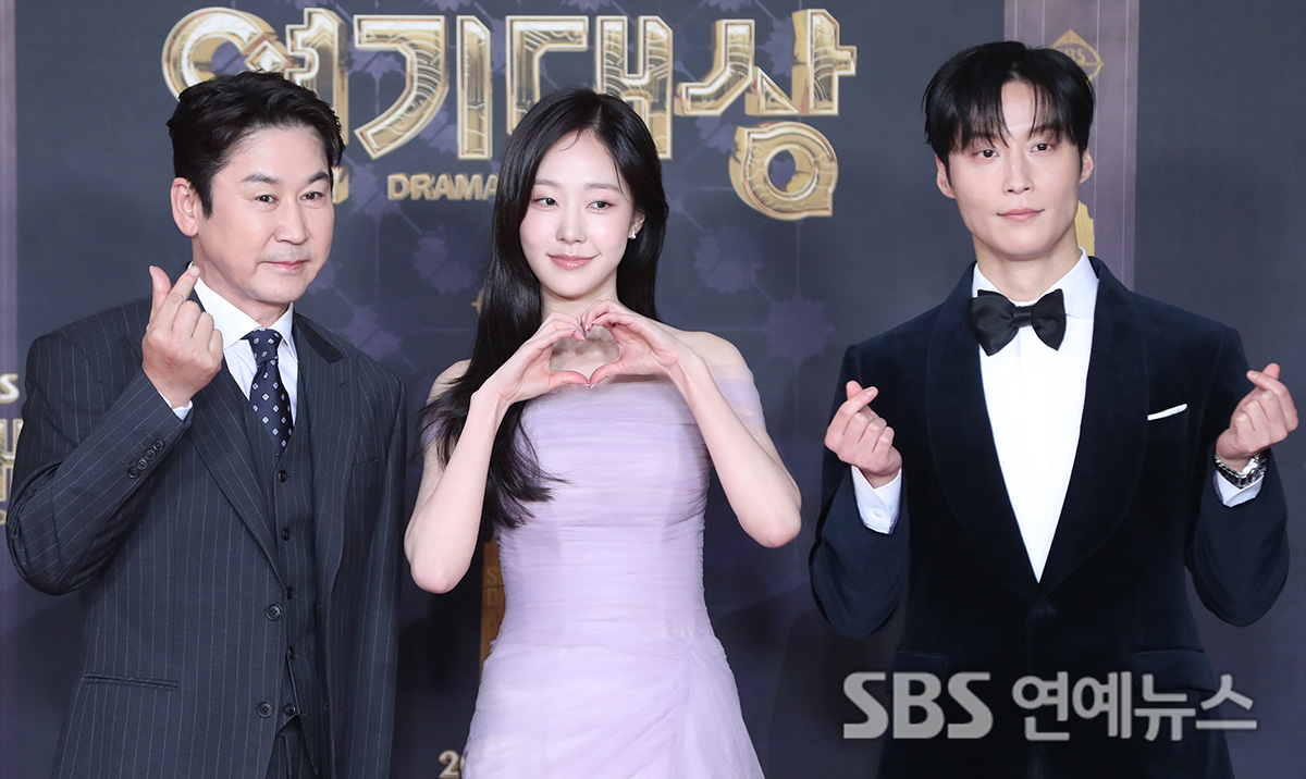 Shin Dong-yup (from left), Chae Won-bin and Heo Nam-joon hit the photo wall at the 2025 SBS Drama Awards, posing at SBS Prism Tower in Seoul on Dec. 31. The trio is set to host the ceremony.