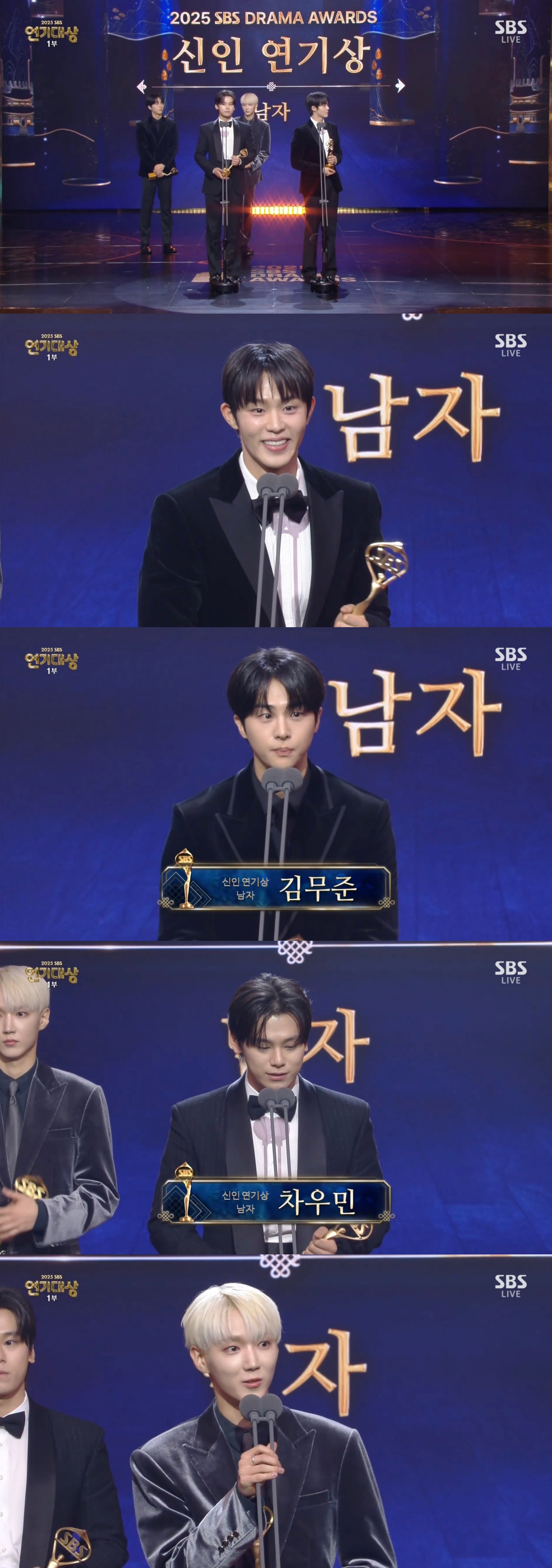 The 2025 SBS Drama Awards handed out its Best New Actor honors to four breakout talents: Kim Dan, Kim Moo-joon, Cha Woo-min, and Ha Yoo-jun.