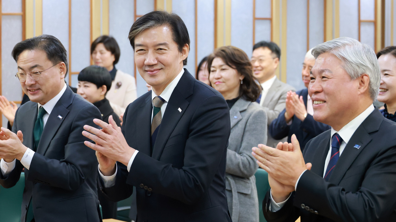 ▲ 조국혁신당 조국 대표와 서왕진 원내대표가 2일 국회의원회관에서 열린 신년회에 참석해 손뼉치고 있다.