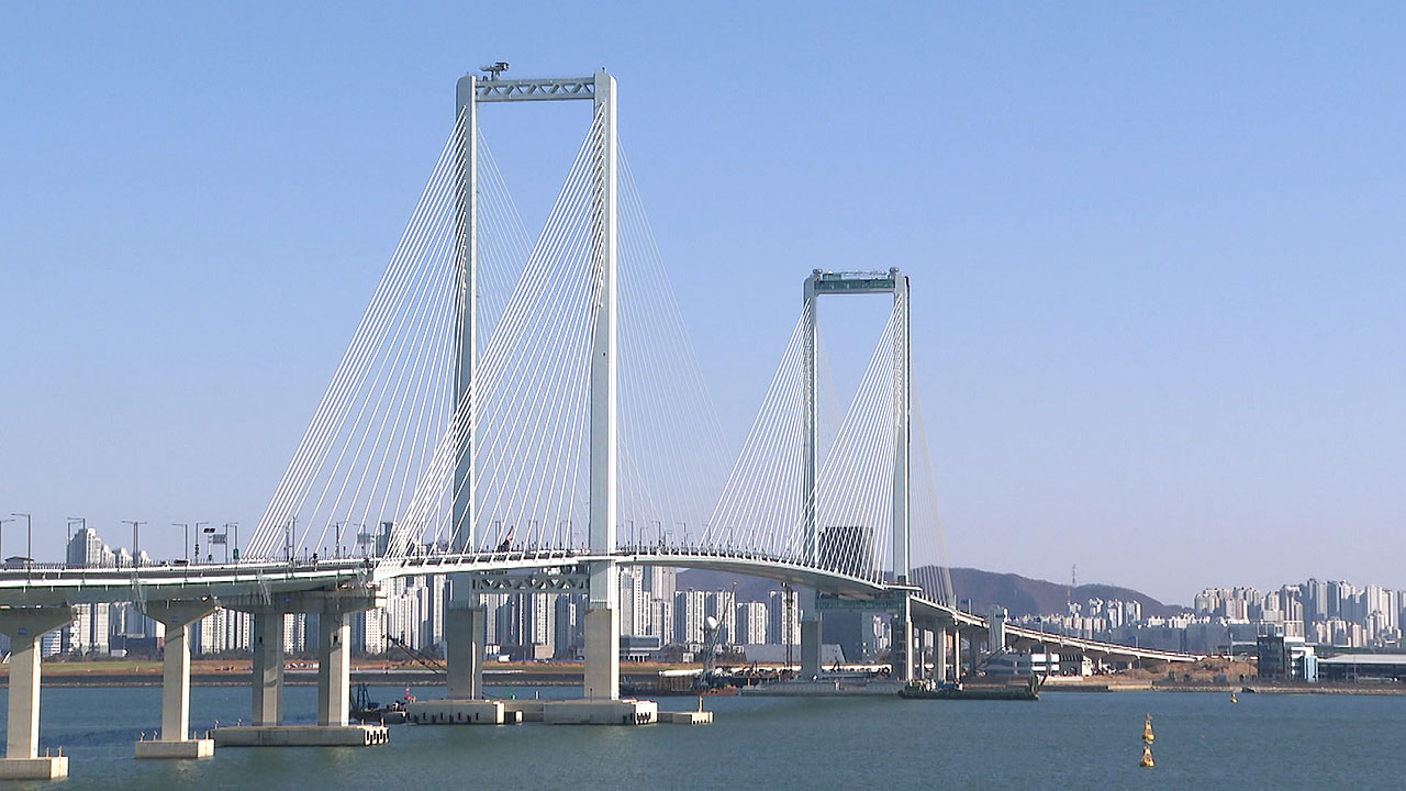 제3연륙교는 '역Y자형'과 'H자형' 등 기존 사장교와 달리 세계적으로도 드문 '문(門) 형식'으로 시공되면서 외관이 수려하다는 평가를 받고 있습니다.