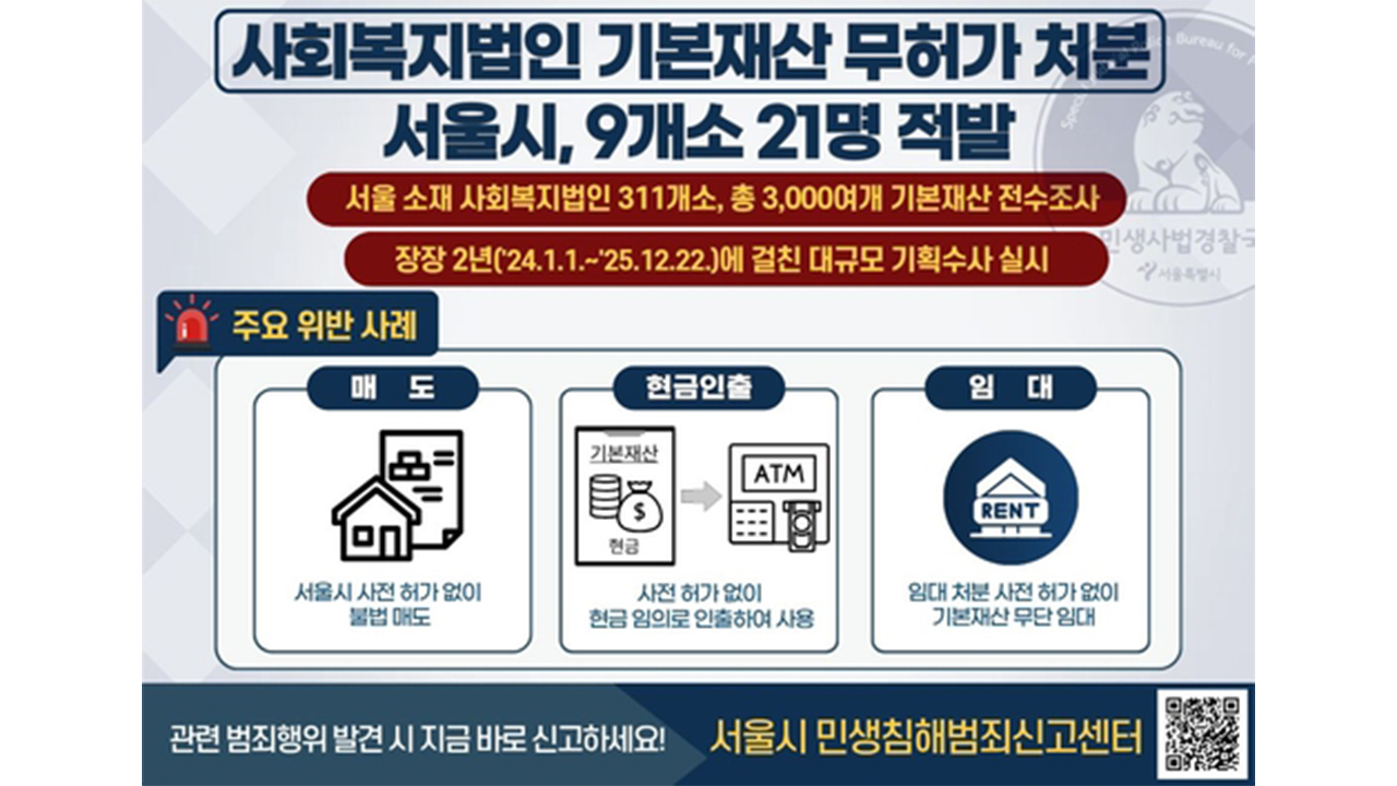 서울시 민생사법경찰국은 기본재산을 시·도지사 허가 없이 임의로 처분한 사회복지법인 9개, 관계자 21명을 적발해 수사 중이라고 밝혔습니다.