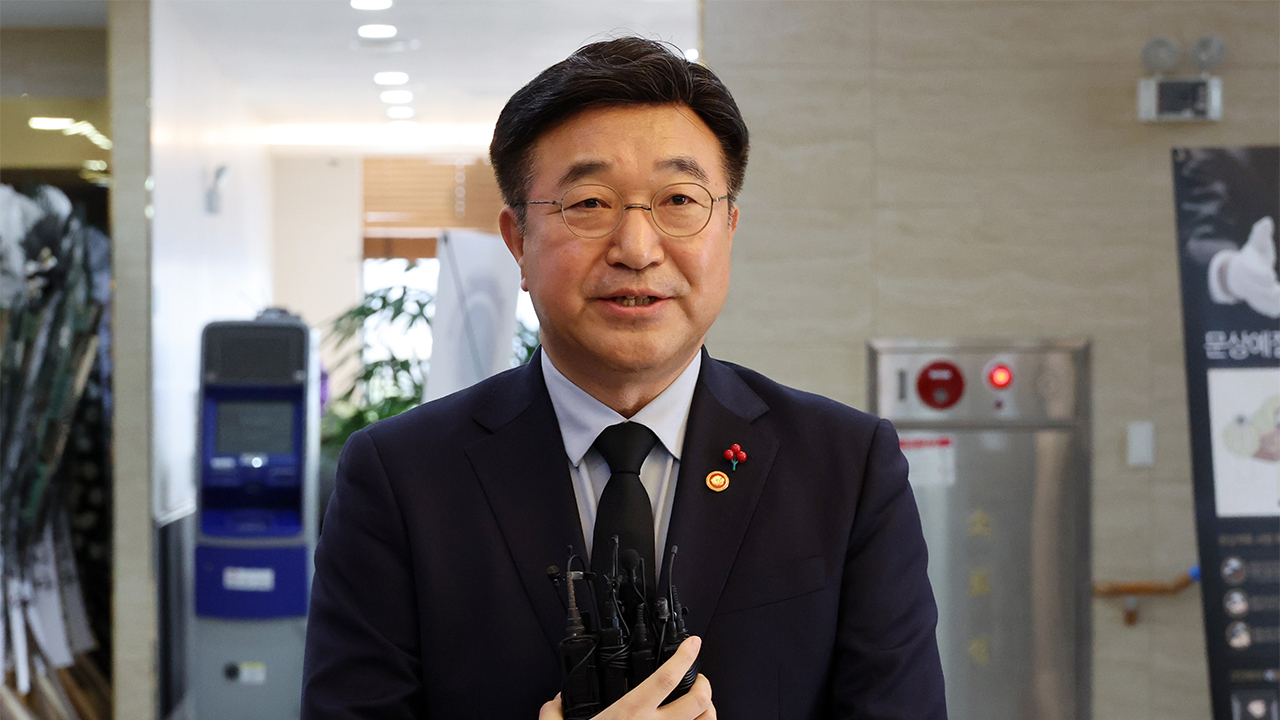 ▲ 윤호중 행정안전부 장관이 5일 전북 전주시민장례문화원에 마련된 고 이승철 경정의 빈소를 찾아 조문한 뒤 취재진의 질문에 답하고 있다.