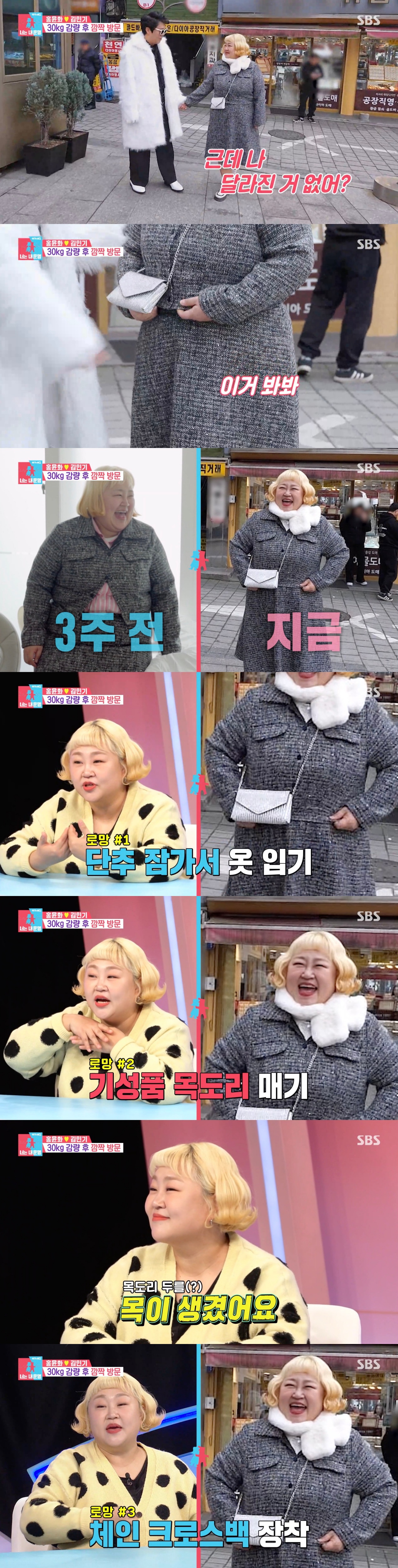 홍윤화는 "저 옷을 입고 여러 가지 로망을 이뤘다. 첫째 저 옷을 단추 잠그고 입기, 일반 사이즈의 기성 목도리하기, 체인 크로스백 옆으로 장착의 꿈을 이뤘다"라며 "원래 목이 추웠던 적이 없는데 목이 생기면서 목이 추운 거다. 그래서 기성 목도리를 할 수 있게 됐다. 그리고 살 빼기 전에는 가방을 저렇게 하면 가방이 가슴 위로 올라왔는데 이제는 딱 제 자리를 찾았다"라고 달라진 점들을 설명해 눈길을 끌었다.