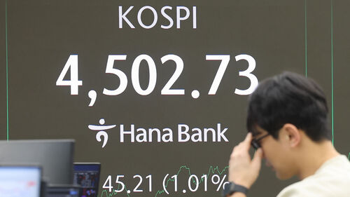 ▲ 코스피가 장중 상승 전환해 사상 처음 4,500선을 돌파한 6일 서울 중구 하나은행 딜링룸 현황판에 코스피 지수 등이 표시되고 있다.