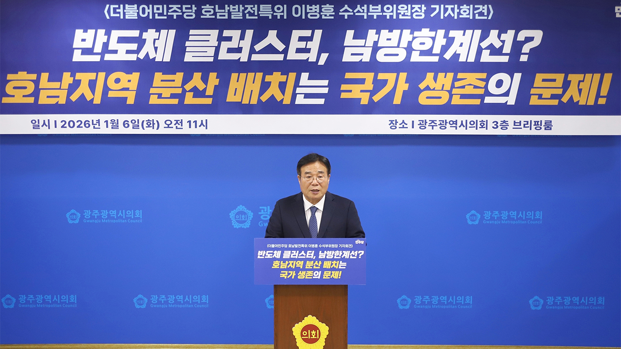 이병훈 더불어민주당 호남발전특별위원회 수석부위원장이 오늘(6일) 광주광역시의회에서 기자회견을 열고 "반도체 클러스터의 호남지역 분산 배치는 국가 생존의 문제"라며 수도권 일극 집중형 반도체 정책의 전환을 촉구했습니다.